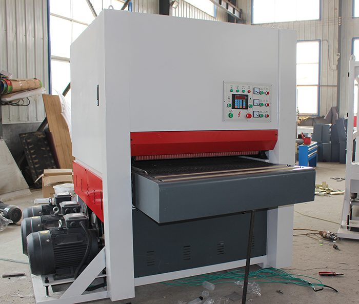 本機采用兩輥一墊式:前砂架為可調式鋼輥、后砂架為組合機構,適應于各類人造板芯板、集成材、旋切木皮的定厚砂光和面皮表面拋光,具有砂削量大、砂光平整度高、拋光效率高、表面光滑等特點,并且采用了進口光電控制砂帶擺動,當遇到斷電、砂帶跑偏或氣壓不足時,設備會自動停機并制動剎車,保護工件不受損傷,該機還配有故障指示燈,出現故障便于及時發現處理,本機采用整體焊接結構,機身剛性強、重量大、性能穩定,使用壽命長。進料采用變頻調速,運行平穩,操作方便。